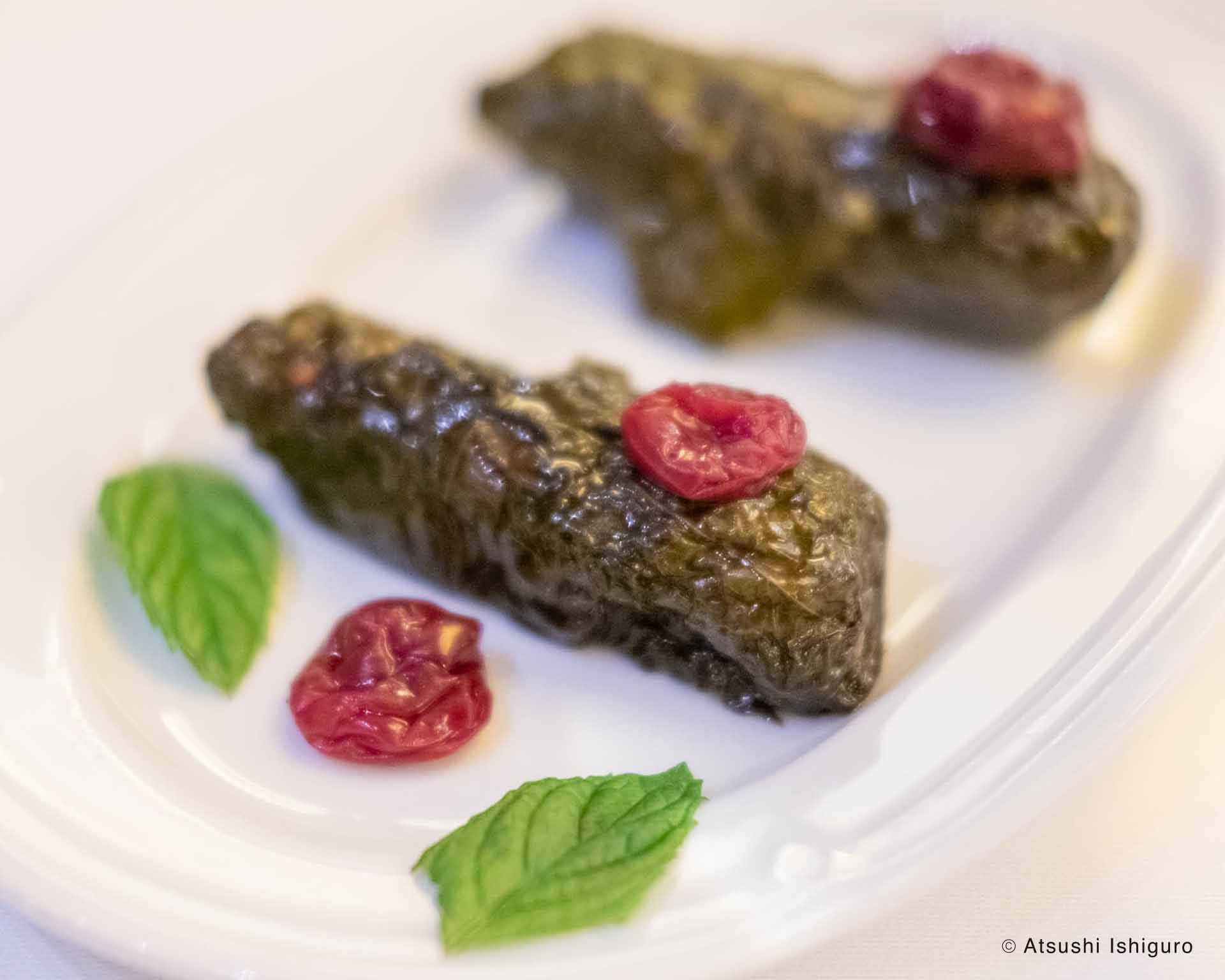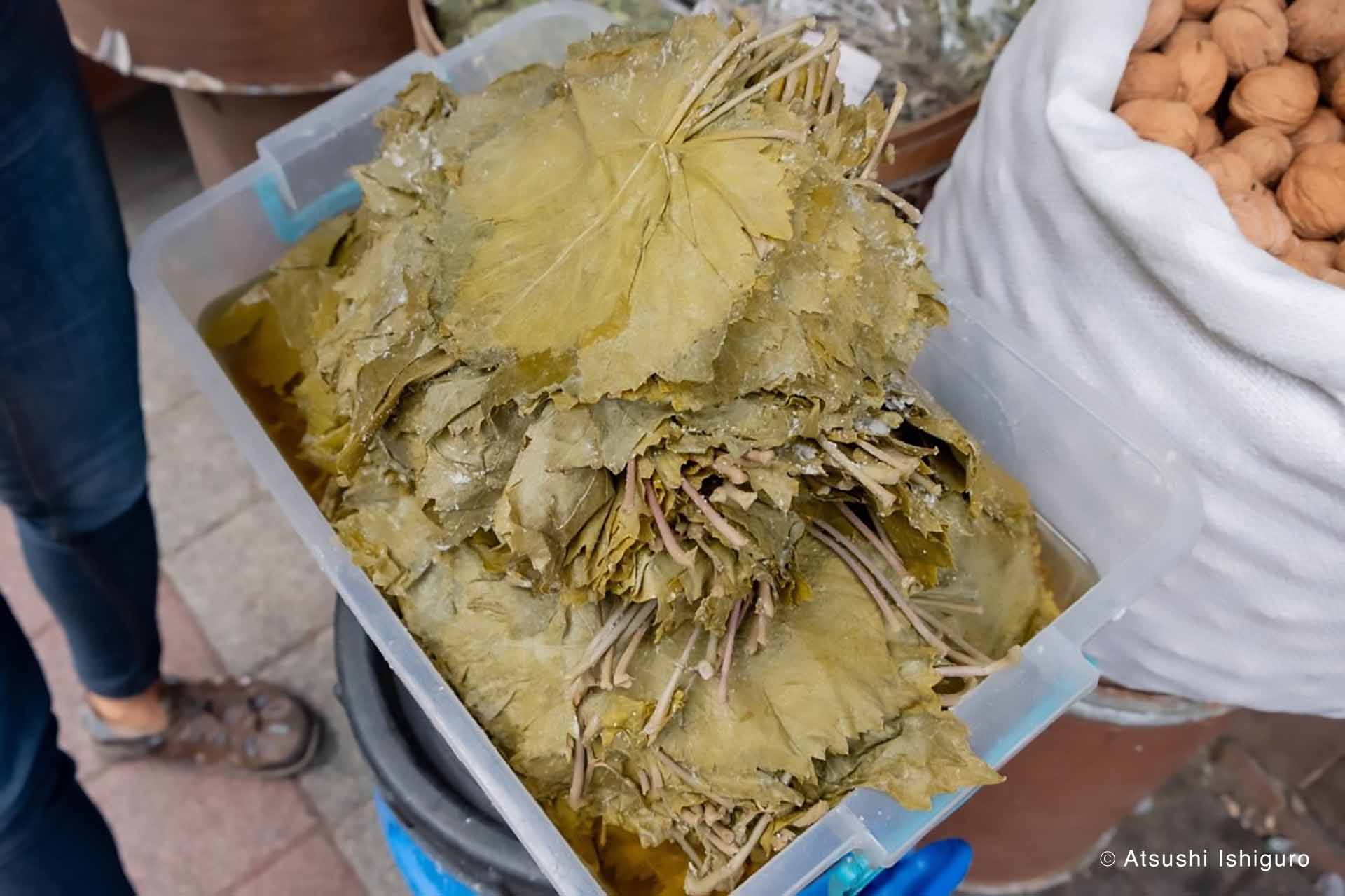 トルコの塩漬けでユニークなのは、ぶどうの葉です。1年保存できるそうです。この塩漬けしたぶどうの葉で、羊のひき肉、玉ねぎ、米、ハーブ類をこねたものを包んでトマトと煮こんだものがトルコの代表的な料理のひとつ、ドルマです。葉の食感は桜の葉の漬物に似てしっかりしています。葉の塩味も上手く利用した、ちょっとロールキャベツにも似た一品でした。発酵と同様に、塩蔵(えんぞう)も大切な食料を保存するための知恵なんですね。