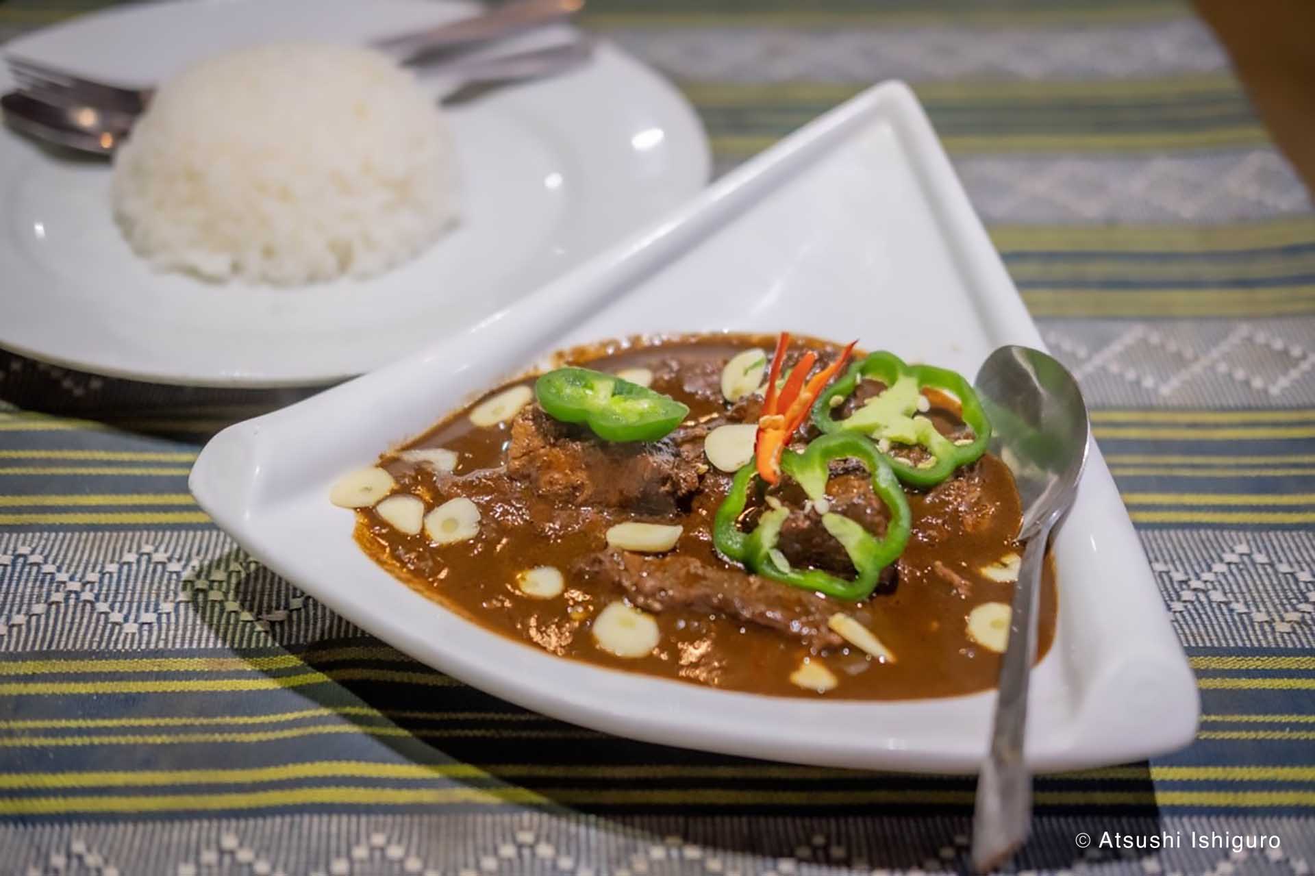 日中に電気バイクを借りて遺産群をあちこちと走り、人通りの多い通りに並んでいるレストランのひとつに入りました。メニューを見てもよくわからないので、若い店員にこの地域ならではのおすすめを聞いてみると、魚の煮込みがいいと教えてくれました。