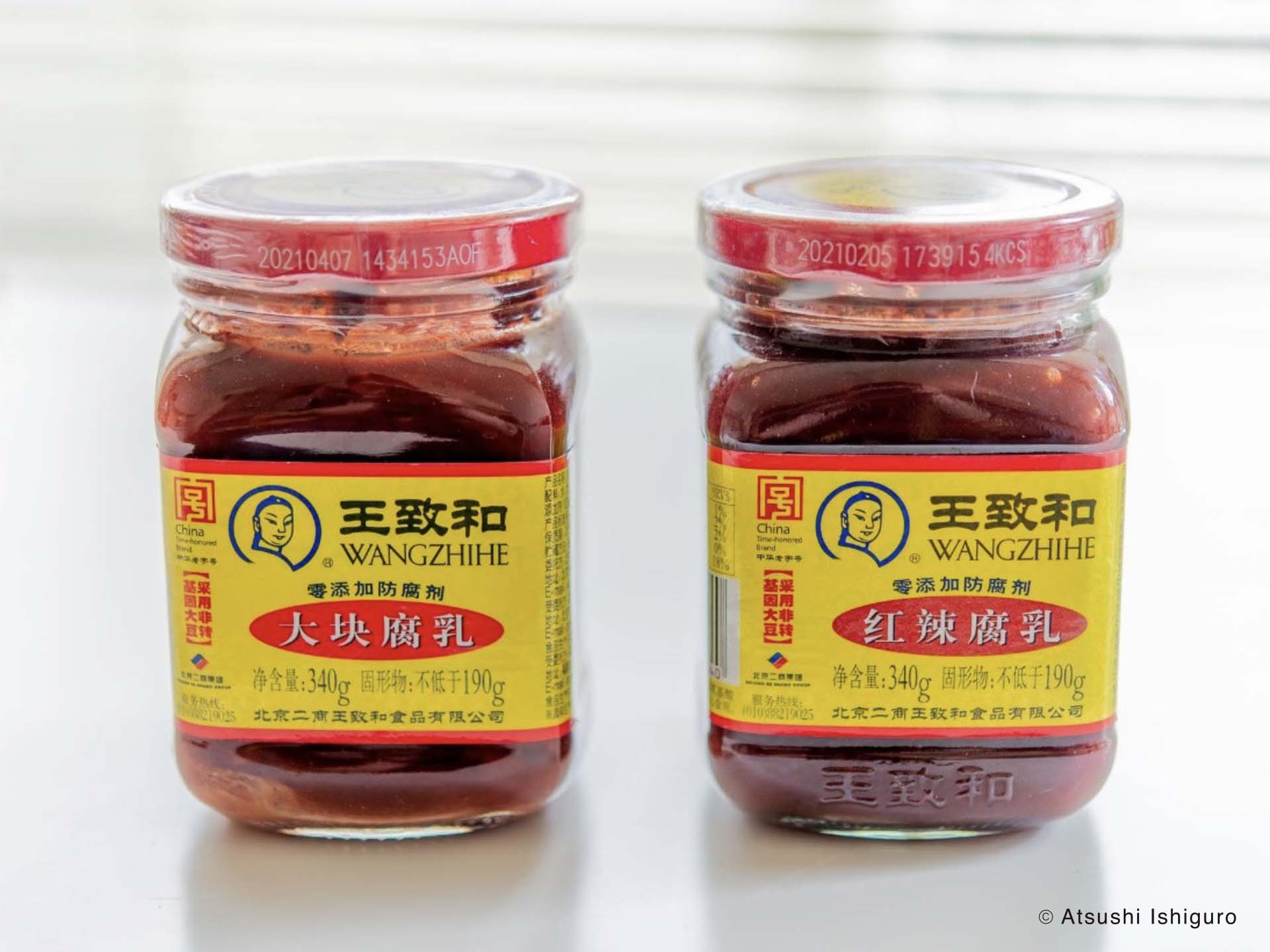 中華食材の店で手に入れたのがこの2種類の「腐乳」。沖縄の豆腐ようの原型です。左がプレーンなもので、右が辛いものです。
