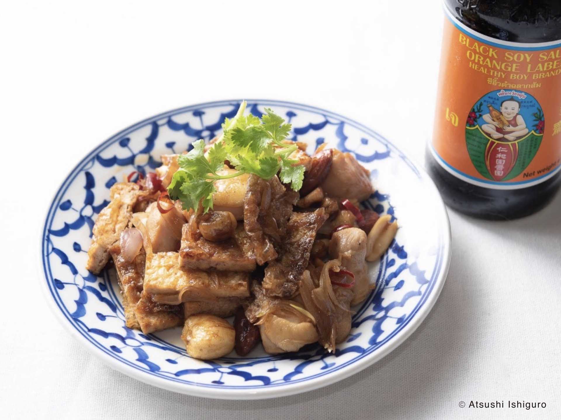 シーユーダムケムを使って、鶏肉と油揚げとナッツの炒め物を作ってみました。スコータイで食べたチキンのカシューナッツ炒めの、あのほっこりとさせてくれる甘じょっぱさを思い出しました。