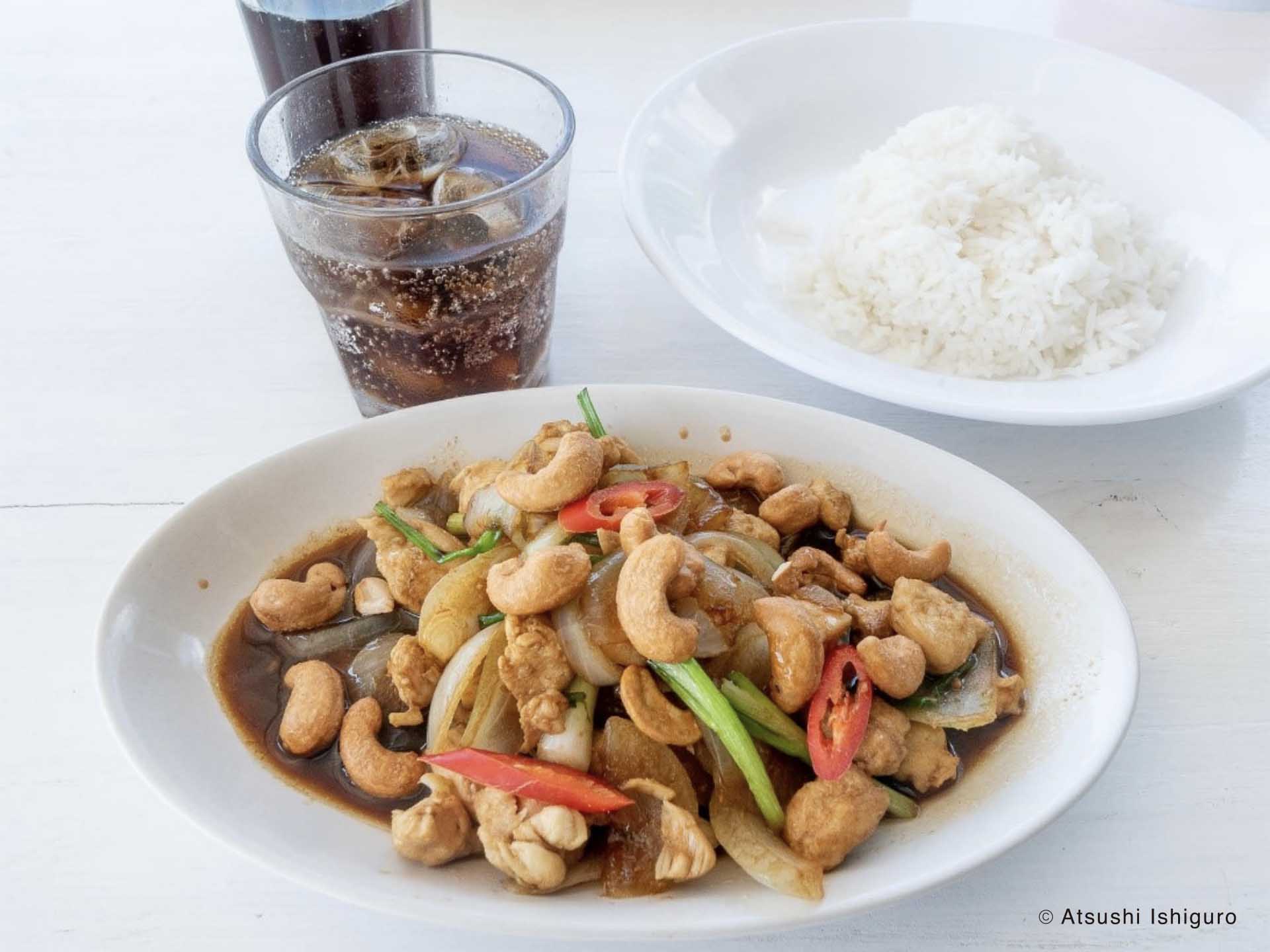 さて、お昼時になればおなかがすきます。ある日は街道沿いの食堂でチキンのカシューナッツ炒めを食べました。店員さんのおすすめです。